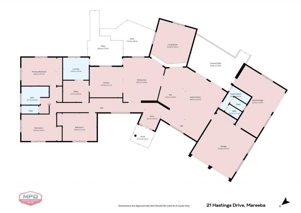 The left wing of the home is where the three bedrooms (with built-in robes), family bathroom, office and laundry are located, and in the right wing you will find the double garage, large storage room with dual access and second bathroom.