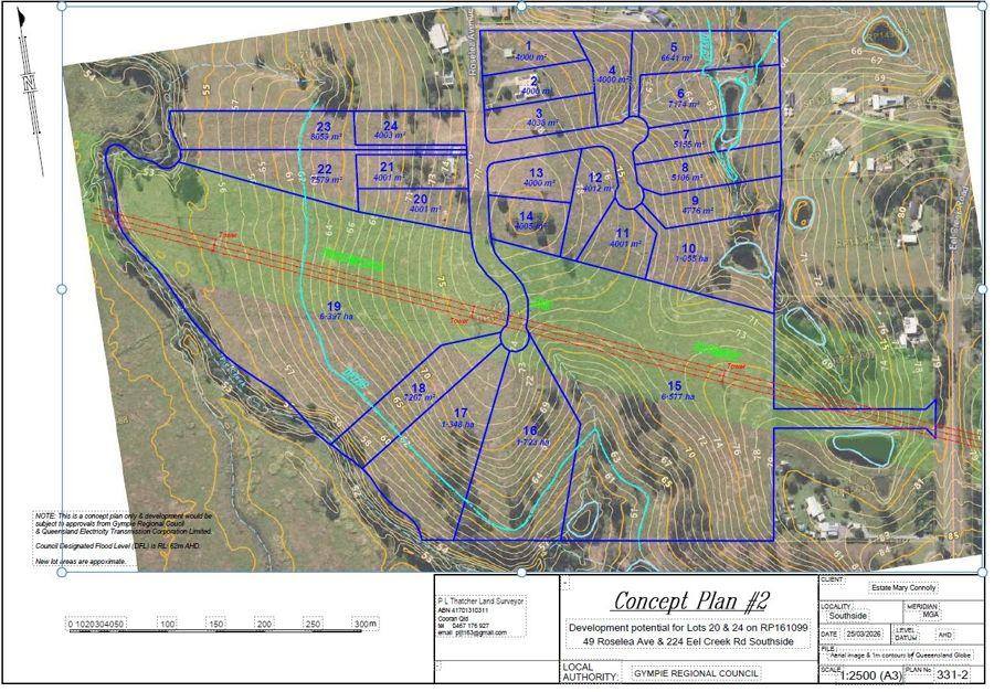 With access from both Roselea Avenue and Eel Creek Road, this property has had a concept plan provided for you. Lot sizes ranging from 4000m2 to over 6 hectares will provide options in these quiet rural surroundings. The current home on the property is a 3 bedroom brick home, double garage and pool, ready for site office or sell to defray the costs of building the road network. Some of the larger parcels will have access to Pie Creek, and a number will have small stock dams.