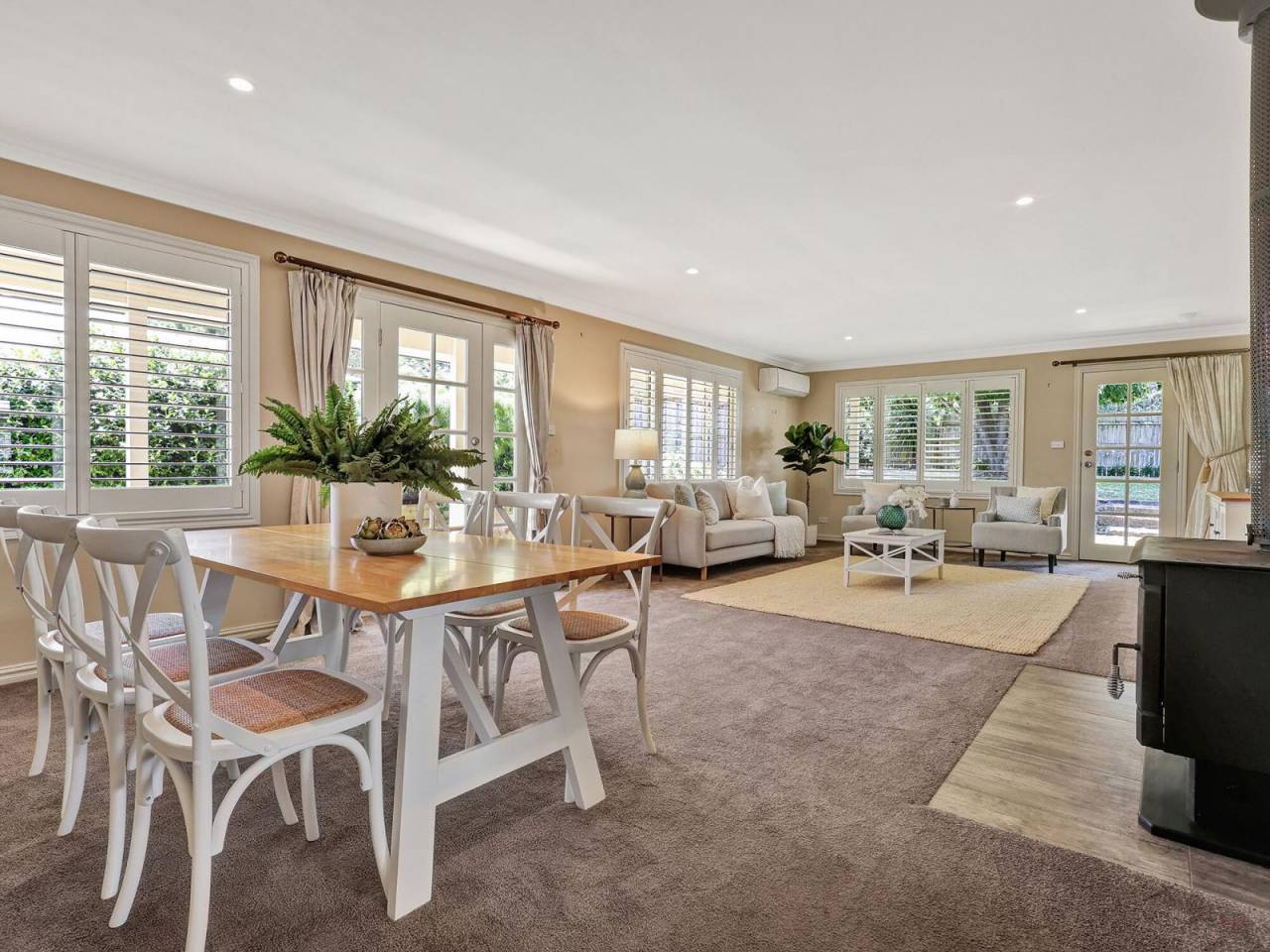 The well-appointed galley style kitchen offers gas cooktop and electric oven, soft close doors and drawers, Caesarstone benchtops and double pantry, flowing seamlessly to the open plan living and dining for easy entertaining, with slow combustion fire, and split system air-conditioning for year round comfort. For excellent home office options, there is also a concealed study nook in living room with a built-in desk, lighting, shelves, drawers with 2 double power points and fixed phone line.