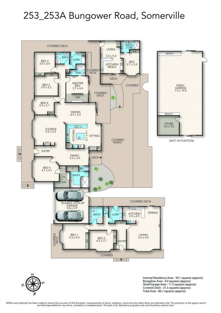 Dwelling one – A welcoming brick entry introduces the five-bedroom main residence. A cosy lounge with a decorative wood fire and separate family room create distinct living zones. At the centre, the dining space links with a quality timber kitchen, sitting area and study nook. Stone benchtops, an island breakfast bar, wine rack, dishwasher and appliance cupboard feature alongside a Miele cooktop and wall oven. The luxury master bedroom enjoys a walk-through robe and ensuite. Three bedrooms include built-in robes, while a fourth has a walk-in robe. Two family bathrooms service the layout, including one with a dual shower. A character-filled laundry, plantation shutters, electric awnings, skylighting, barn doors and statement tiling add to the appeal.