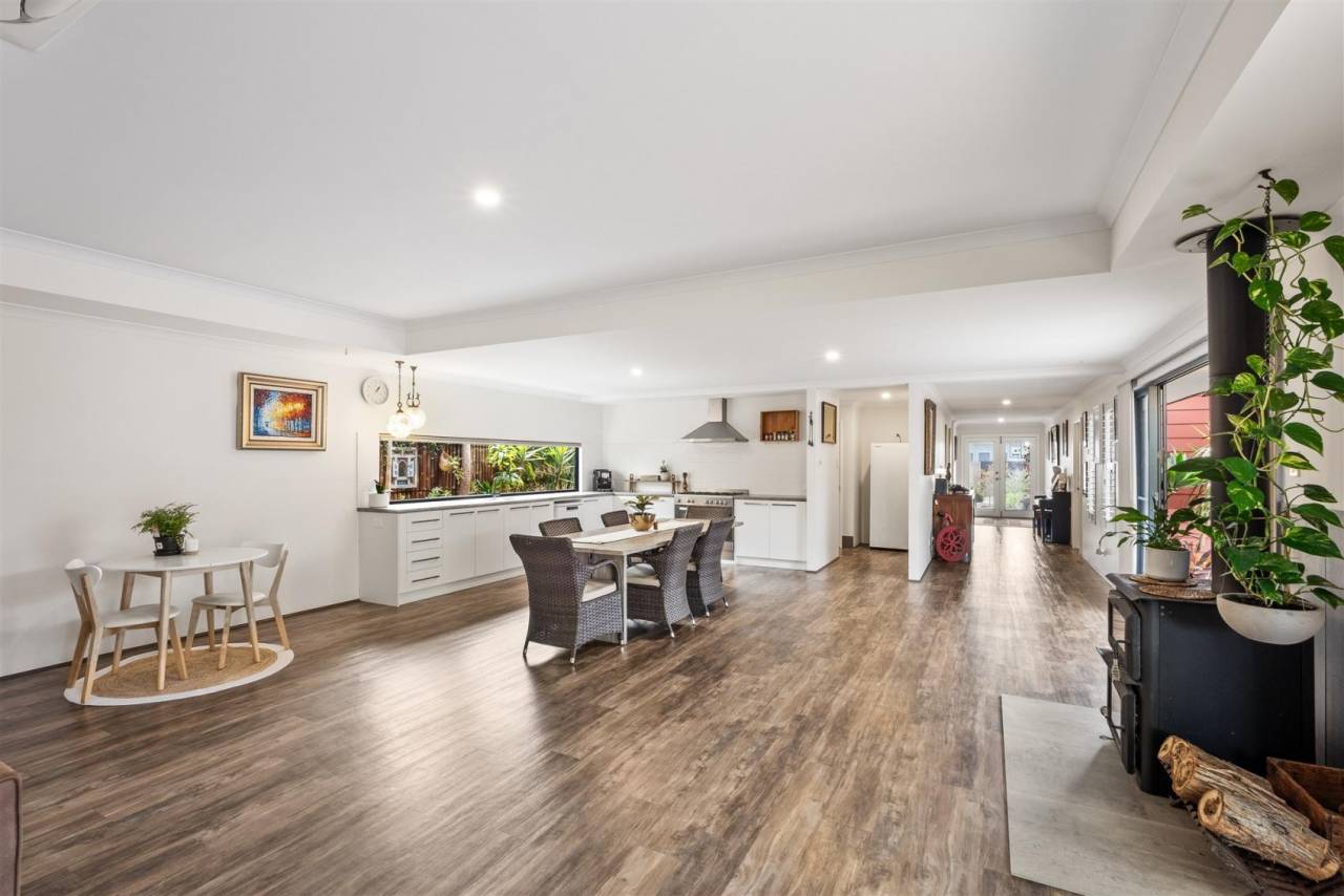 When you step inside, the home immediately showcases its sense of scale, with a wide entrance hallway leading through to the expansive open-plan living and dining area. Designed to connect seamlessly with the backyard, this central space creates an inviting environment for both everyday family life and entertaining. High ceilings enhance the feeling of openness, while a slow-combustion wood heater adds warmth and character during the cooler months. The well-appointed kitchen forms the heart of the home, featuring a freestanding 900mm stainless steel oven, five-burner gas cooktop, dishwasher and generous bench space, along with a large walk-in scullery providing excellent storage and practicality.