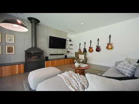 Inside, the home is set over two levels with a great sense of separation between living zones and accommodation. Polished concrete floors, Blackbutt detailing and extensive double glazing set the tone, while the open plan living and dining area is anchored by a statement wood fireplace. The kitchen is made for hosting, with quality European appliances including twin ovens, induction cooktop and dishwasher, butlers pantry plus plenty of bench space.