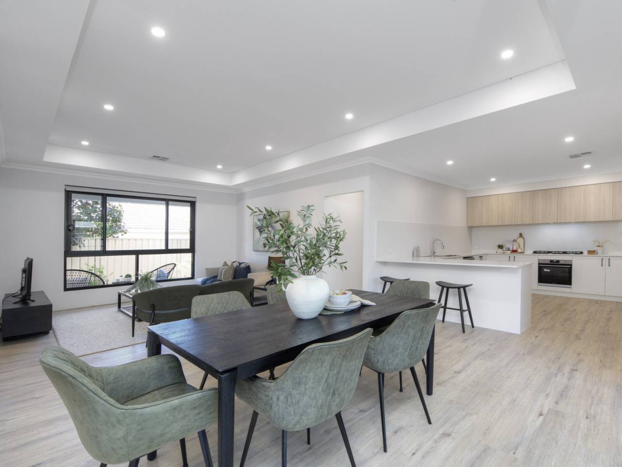 Big open plan lounge, kitchen, dining and living space. Chef's kitchen with plenty of countertop space storage and a separate scullery.