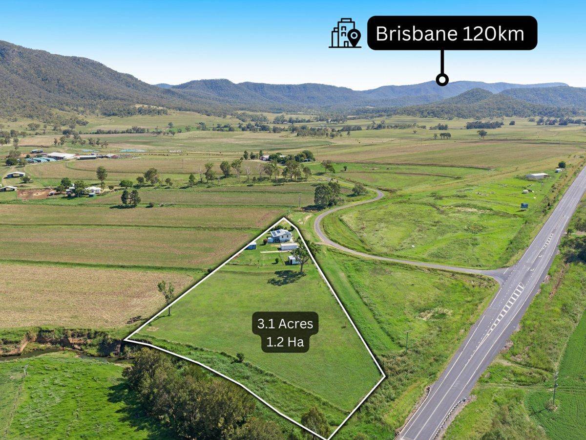 ...an EVERYDAYER or WEEKENDER or INVESTER...Get yourselves here to view and consider for yourselves, goodness me, what a great, solid and sturdy residence, what a great place to call home. Built in 1965, this home is set up from the ground well on good stumps, the frame of this home would be hardwood, it is freshly painted, there are excellent living rooms, space to move, plenty of natural light and air flow. Important to mention in our preparation for sale, the rainwater tank has been cleaned and checked, all wiring has been checked and upgraded where required to be current compliance standard, compliant hard wired smoke alarms are installed, the property is spacious. This property would ideally suit those folks who wish to live and work in the area, or live and work from here to Warwick, Toowoomba, Ipswich, or Brisbane. You are situated approximately 120 kilometres from Brisbane, 30 kilometres from Warwick, our Land Area is 3.1 acres or 1.2 Hectare, you have an excellent Bore with pottable, drinkable water, Bore water that is suitable for gardens and you too. There is a 5,000 gallon rainwater tank, pressure pump on both rainwater and borewater. Seller shares our bore is plumbed to rainwater tank, should you need rely on the Bore in dry times. The Creek is a delightful addition to this property, you front the creek here. Our property is fully fenced, well fenced, there is a 5 x 9 metre workshop, shed, garage, this has a sliding door, there is also a two bay open shed, this is higher opening, it has sheeting on three sides only, there is a great couple of stables, suitable for the animals you may have, large or small. All infrastructure is easy to see in our image carousel, effortless to decipher their position on the property with our floor plan, placement plan and drone shots.