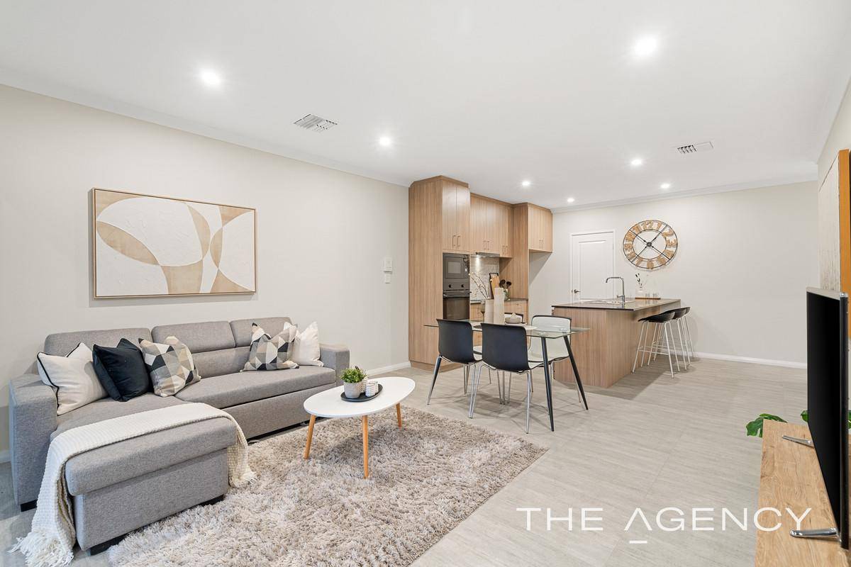 A striking double-storey façade introduces light-filled interiors anchored by bright open-plan living and dining spaces. Expansive sliding glass doors usher in natural sunlight and connect seamlessly to your own private outdoor area—either a spacious balcony with a modern slatted pergola and glass balustrade, or a paved courtyard framed by landscaped gardens and secure fencing. Entertain or unwind in absolute comfort all year round, enhanced by split system air conditioning.