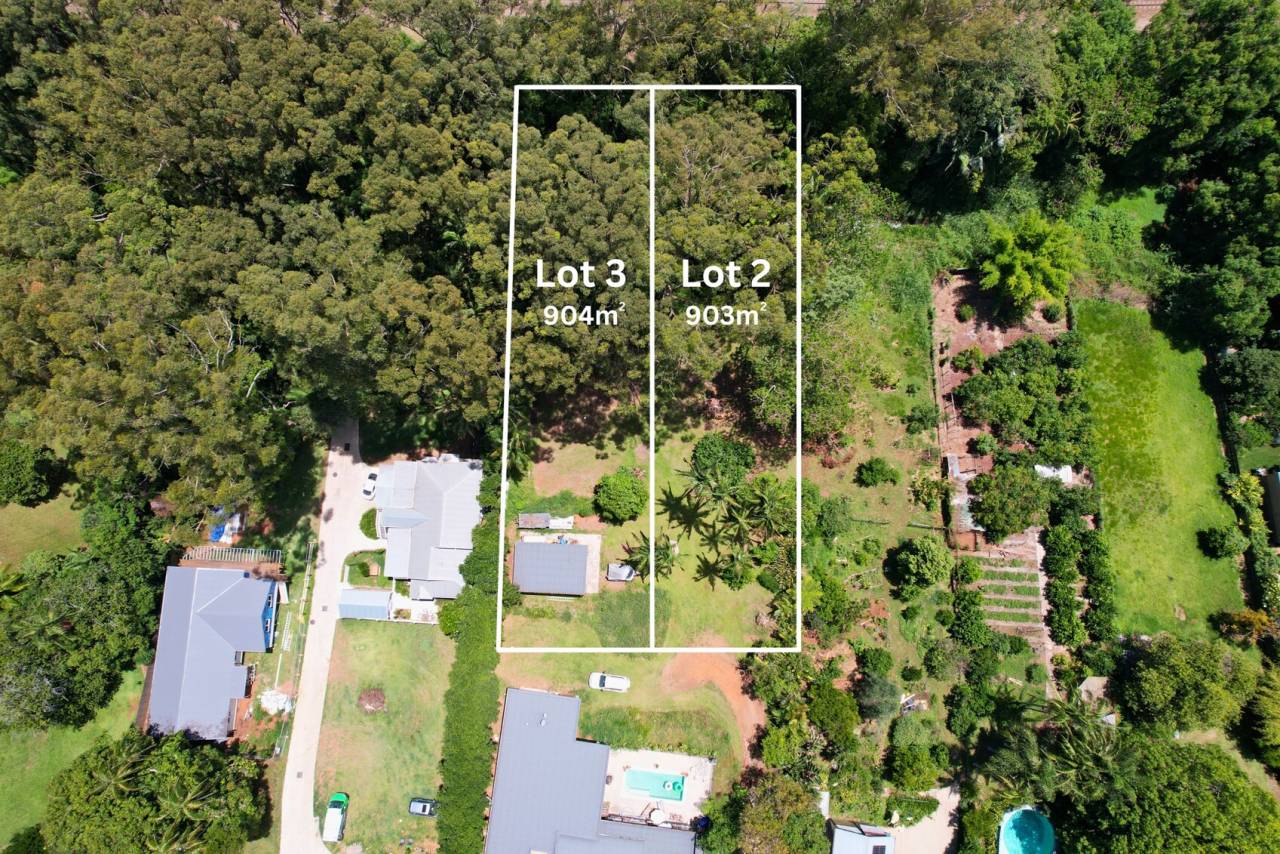 - Block 1 – 903m²: A generous parcel of land surrounded by native trees and a peaceful creek outlook. This block provides the perfect blank canvas to design and build a home that embraces its natural setting while staying connected to the heart of Palmwoods.