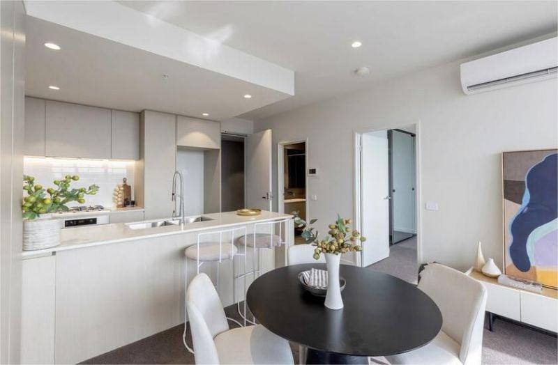 Residents enjoy access to premium shared facilities, including a comfortable lounge area with fireplace, a private entertaining space complete with catering kitchen and wine storage, plus a spectacular rooftop retreat. The rooftop showcases a landscaped pool and spa area, outdoor cooking facilities, and dining spaces that take in sweeping views from the Dandenongs through to the city skyline. A dedicated fitness center with Technogym equipment is also available exclusively for residents.
