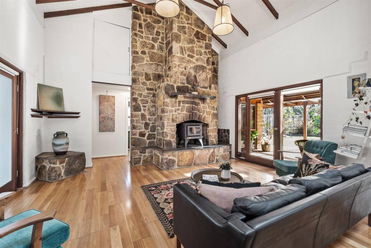 Iconic Margaret River elegance is encapsulated in this centrally located home. A stone's throw from the vibrant farmer's market, it offers an easy stroll through the neighbouring off-lead dog park to schools and the town centre. The residence's solid mudbrick and timber frame construction exudes a timeless allure, with its cathedral ceilings, adorned with exposed Jarrah beams, rising above the open living/dining spaces. An impressive hand-built local granite fireplace stands as the heart of the home, inviting cosy evenings during the cooler months.
