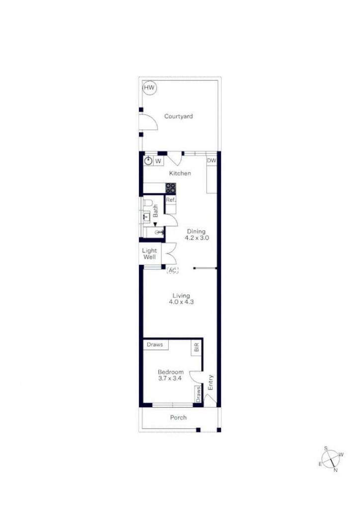 Behind its classic block-fronted façade, the home reveals a light-filled interior with high ceilings and a relaxed, contemporary feel. The open-plan living and dining area flows seamlessly to a private, sunlit courtyard, ideal for quiet mornings or relaxed evenings at home.