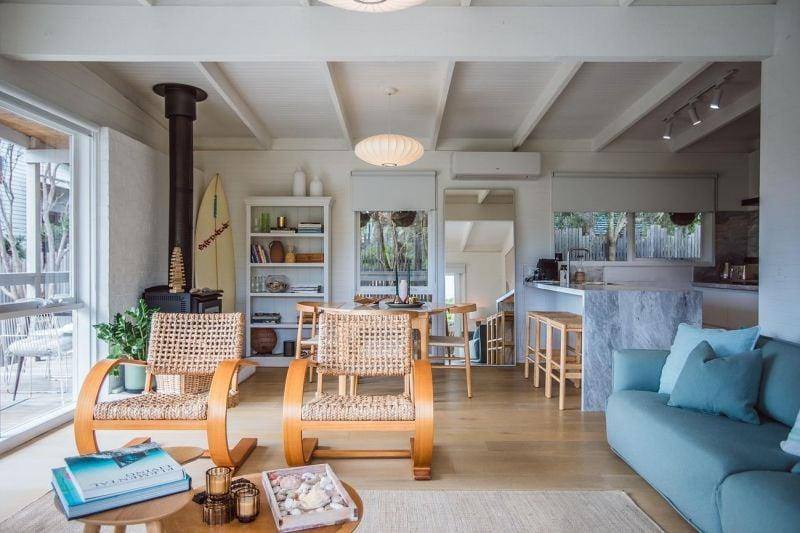 The house is light filled and in the afternoon when the sun is setting gets a beautiful warm flow. Relax on the couch or in the porch, put your feet up and breathe in the fresh ocean air. In the winter sit in front of the woodfire heater and enjoy the tea tree lined view.